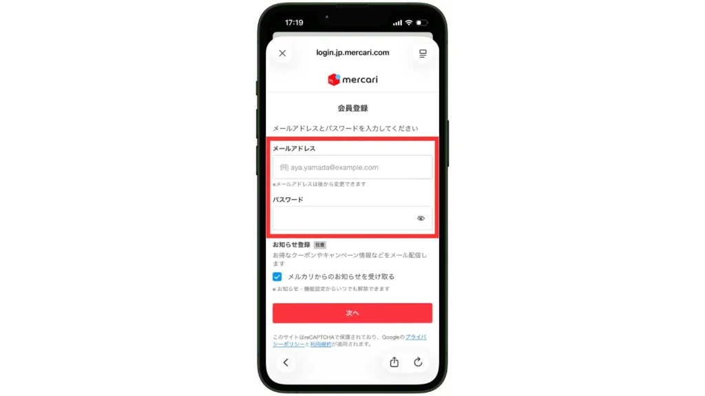 を入力して「次へ」をタップすると