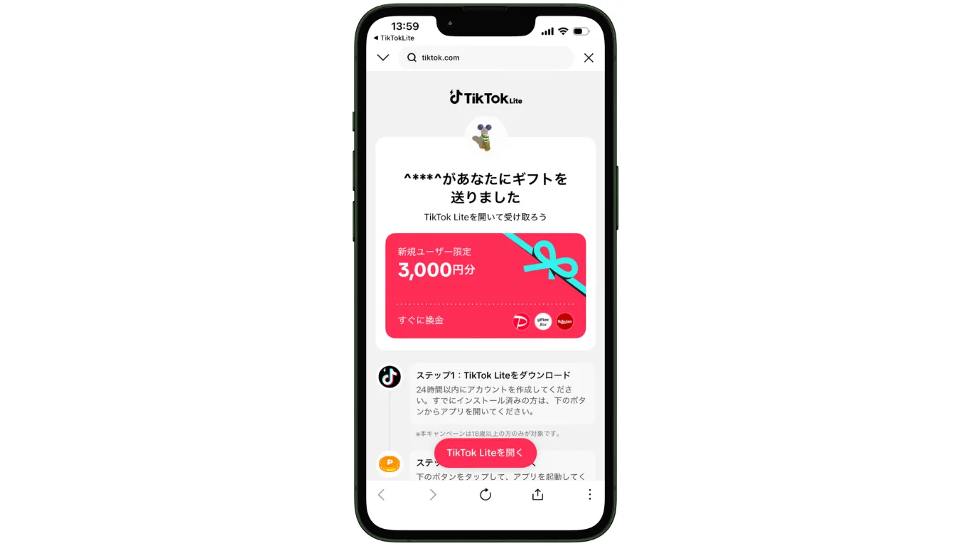 ここからは、「TikTok Lite」の友達招待キャンペーンで3,000円もらう方法を詳しく解説していきます。