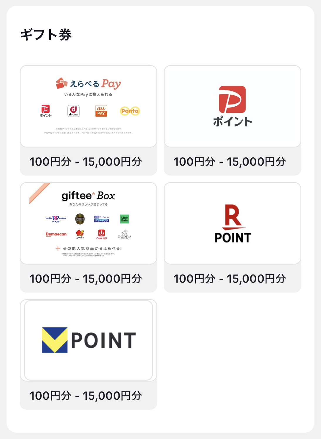 | 選択可能なギフト | PayPayポイント 楽天ポイント Vポイント えらべるPay(PayPay/dポイント/auPay/Pontaなど) gifteeBox(スターバックス/Amazonなどのギフト券) |